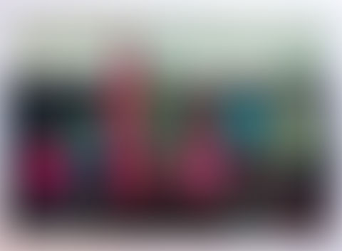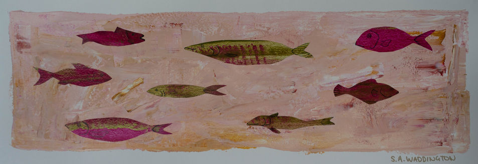 Left over Acrylic paints layered on paper allowed me to pick out animal shapes until I had found them all. Oil pastel details on top.